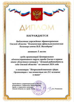 Офтальмологическая больница им. В.П. Выходцева заняла первое место в конкурсе "Лучший работодатель года" Мы стали лучшими в номинации "Непроизводственная сфера" среди всех организаций Центрального округа Омска с коллективом больше 250 человек. Это общая победа всей нашей команды! Спасибо каждому, кто делает больницу лучше каждый день.